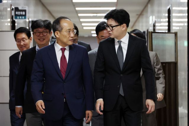다만 추 원내대표는 전날 윤한 면담과 관련, 본인이 이를 평가하는 것은 "적절치 않다"면서도 "(면담을 계기로) 당정이 더욱 긴밀히 협의하면서 단합하고 하나가 되는 그런 모습을 만들어 가야 한다"고 말해 눈길을 끌었다. 한 대표를 겨냥한 '윤 대통령과의 차별화를 멈추고 당정일치 기조를 보여야 한다'는 취지의 친윤계 측 비판을 에둘러 강조한 것으로 풀이된다.