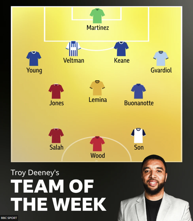 중원엔 커티스 존스(리버풀), 마리오 르미나(울버햄프턴), 파쿤도 부오나노테(레스터 시티)가 뽑혔다. 백4는 요슈코 그바르디올(맨체스터 시티), 마이클 킨(에버턴), 조엘 펠트만(브라이턴), 애슐리 영(에버턴)으로 구성됐다. 골키퍼는 애스턴 빌라의 아르헨티나 국가대표 골키퍼 에밀리아노 마르티네스가 이름을 올렸다.