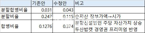 이 과정에서 기존 두산에너빌리티와 분할신설법인의 분할 비율은 1대 0.2474030에서 1대 0.1157542로 낮아졌다. 하지만 결과적으로 분할신설법인의 총 발행주식수가 절반으로 줄었고, 주당 자산가치는 상승하는 효과를 가져왔다.