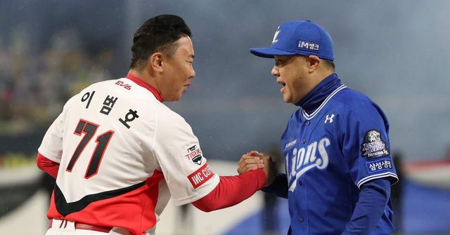 지난 21일 오후 광주 북구 기아챔피언스필드에서 열린 프로야구 '2024 신한 SOL 뱅크 KBO 포스트시즌' 한국시리즈 1차전 삼성 라이온즈와 KIA 타이거즈의 경기 사전 행사에서 이범호 KIA 감독과 박진만 삼성 감독아 악수를 나누고 있다. / 뉴스1