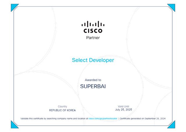 슈퍼브에이아이는 국내 기업 최초로 시스코의 비전 AI 분야 ‘셀렉트 디벨로퍼(Select Developer)’ 자격을 취득하여, 두 회사 간 협력 관계를 더욱 공고히 했다.