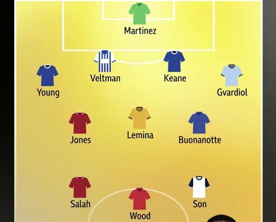 중원에는 커티스 존스(리버풀), 마리오 르미나(울버햄프턴), 파쿤도 부오나노테(레스터 시티)가 이름을 올렸다. 수비진에는 요슈코 그바르디올(맨체스터 시티), 마이클 킨(에버턴), 조엘 펠트만(브라이턴), 애슐리 영(에버턴)이 뽑혔다. 골키퍼는 에밀리아노 마르티네스(애스턴 빌라)였다.