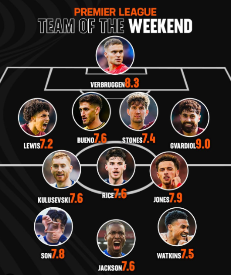 4-3-3 포메이션으로 짜여진 가운데 손흥민은 평점 7.8로 공격진 중 최고 평점을 받으며 오른쪽 공격수 자리에 이름을 올렸다. 가운데는 첼시의 니콜라 잭슨(7.6)이었고, 왼쪽은 애스턴 빌라의 올리 왓킨스(7.5)였다. 데얀 쿨루세브스키도 평점 7.6점을 받으며 데클런 라이스(아스널), 커티스 존스(리버풀)와 함께 중원 한 자리를 차지했다. 수비진은 리코 루이스, 존 스톤스, 요슈코 그바르디올(이상 맨체스터 시티), 산티아고 부에노(울버햄튼)가 선정됐고, 골키퍼는 브라이턴 수문장 바르트 페르브뤼헌이 이름을 올렸다.