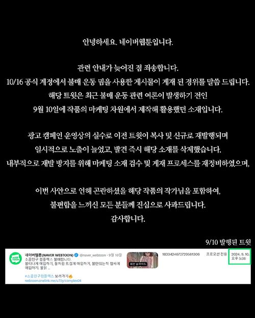 당시 네이버웹툰은 "해당 게시글은 최근 불매운동 관련 여론이 발생하기 전인 9월 10일에 작품 마케팅 차원에서 제작해 활용했던 소재"라며 "이번 사안으로 인해 곤란하셨을 해당 작품의 작가를 포함해 불편함을 느끼신 모든 분들께 진심으로 사과 드린다"고 고개를 숙였다.