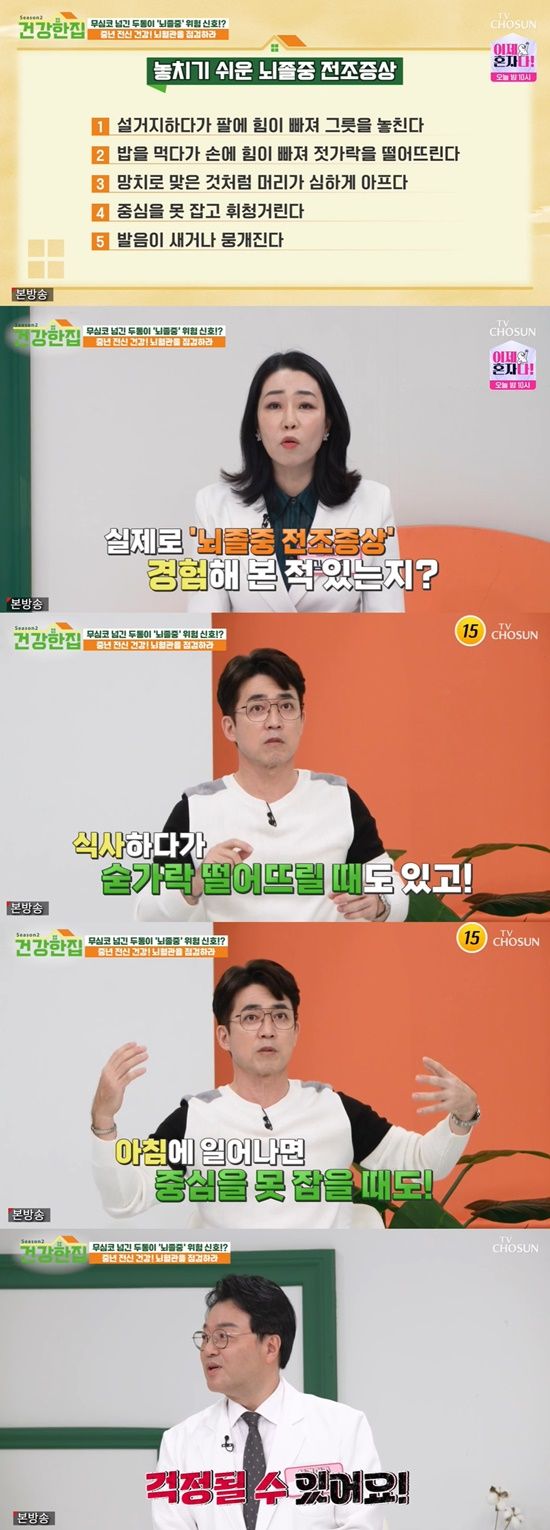 이에 신경외과 고도일은 "걱정이 될 수 있다. 뇌졸중 전조증상은 뇌혈류가 줄었다가 다시 늘어나면서 감쪽같이 사라진다. 이게 관절 문제인지 수면 부족 문제인지 가볍게 치부하는 경우가 많다"며 "이런 증상이 반복적이고 강하고 길게 일어난다면 정말 위험한 뇌경색이 임박해서 나타나는 신호일 수 있다"고 말했다.