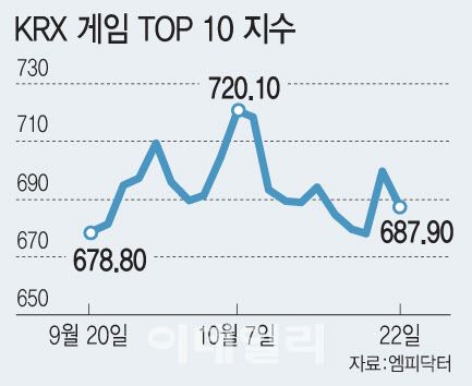 22일 엠피닥터에 따르면 국내 대표 게임 10개 종목으로 구성된 ‘KRX 게임 TOP 10 지수’는 이날 1.66%(11.63포인트) 하락한 687.90에 거래를 마쳤다. 코스피 하락률(1.31%)보다 더 떨어진 수치다. 특히 KRX 게임 TOP 10 지수는 이달 초까지만 해도 게임주 반등에 힘입어 1년 4개월여 만에 720선을 웃돌았으나, 현재는 4% 넘게 빠졌다.