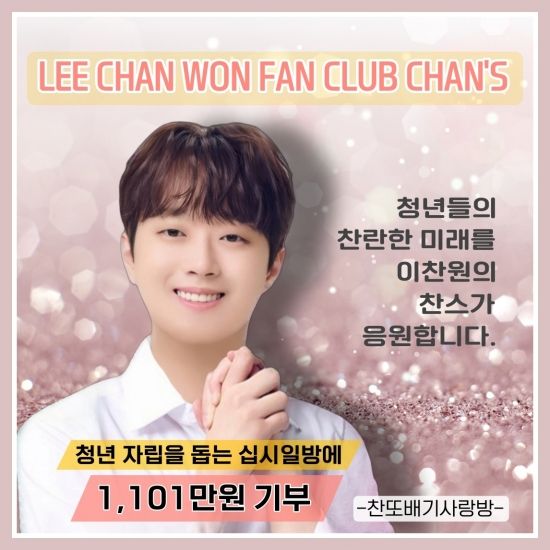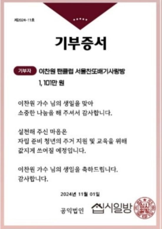 최근 이찬원 팬클럽 '서울찬또배기사랑방'은 11월 1일 가수 이찬원의 생일을 기념해 자립 준비 청년의 성장을 돕는 공익법인 십시일방에 1,101만 원을 기부했다고 밝혔다.