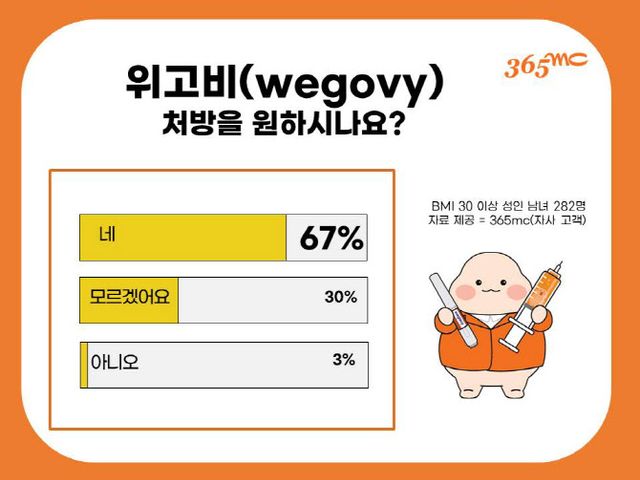 지방흡입 특화 의료기관 365mc가 지난 14일 365mc 21개 국내 네트워크 지점 BMI 30 이상 고객 282명의 대상으로 한 설문조사에 따르면, 응답자 중 71%(202명)가 위고비를 이미 알고 있었고 67%(189명)가 위고비를 처방 받고 싶다고 답했다. 위고비 출시 전부터 고도비만 환자들의 위고비에 대한 기대감이 높다는 사실을 엿볼 수 있다.