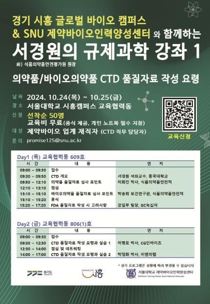[와이뉴스] 시흥시는 10월 24일부터 25일까지 서울대학교 시흥캠퍼스 교육협력동에서 ‘의약품 및 바이오의약품 국제공통기술문서(CTD) 품질자료 작성 요령’에 대해 이론 및 실습 교육을 진행한다.