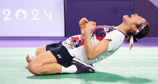 지난 8월 5일(현지 시각) 프랑스 파리 포르트드 라 샤펠 아레나에서 열린 2024 파리올림픽 배드민턴 여자 단식 결승전에서 한국 안세영이 중국 허빙자오를 이기고 우승을 확정한 뒤 기뻐하고 있다. / 연합뉴스