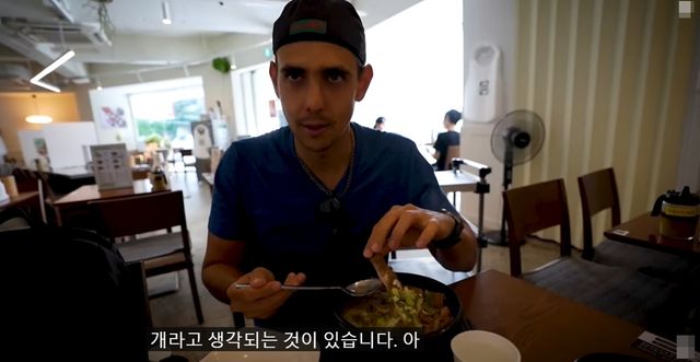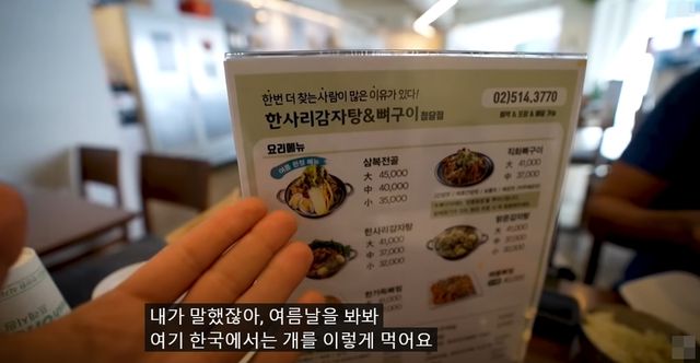 그는 메뉴판을 가리키며 "여기 한국에서는 개를 이렇게 먹는다"며 돼지 요리를 졸지에 개 요리로 둔갑시켰다. 이어 "여기에선 (지금 같은) 여름에 개를 먹는다. 우리 진짜 충격받았다"며 혐오스럽다는 제스츄어를 했다.