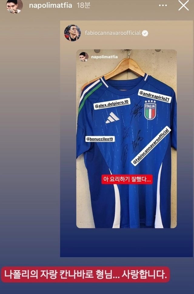 나폴리 맛피아는 사진과 함께 "전설적인 이탈리아 축구 선수들을 위해 이탈리아 요리를 할 수 있어 영광이다"라는 글을 게재했다. 아울러 네 사람의 사인이 적힌 유니폼을 자신의 인스타그램 스토리에 공유하며 "나폴리의 자랑 칸나바로 형님. 사랑합니다"라는 글을 통해 선수를 향한 애정을 드러냈다.