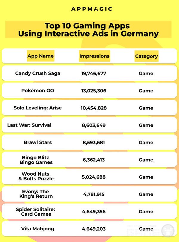 이 목록에는 다양한 유형의 비게임 앱과 게임이 포함되어 있어 인터랙티브 광고가 다양한 카테고리에서 잘 작동할 수 있음을 시사한다.