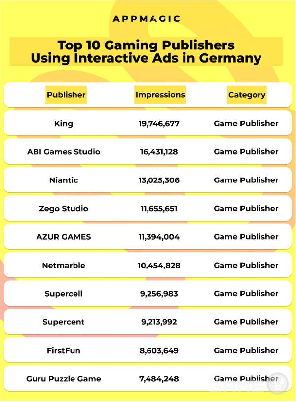 ◇ 독일에서 인터랙티브 광고를 사용하는 상위 10대 게임 및 <>상위 10대 비게임 퍼블리셔