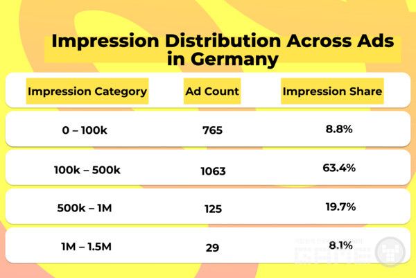 대부분의 광고의 도달 범위가 보통이다: 대부분의 광고(63.4%)의 노출 수는 10만에서 50만 사이로, 대부분의 인터랙티브 광고가 중간 정도의 잠재고객에게 도달한다는 것을 의미한다.
