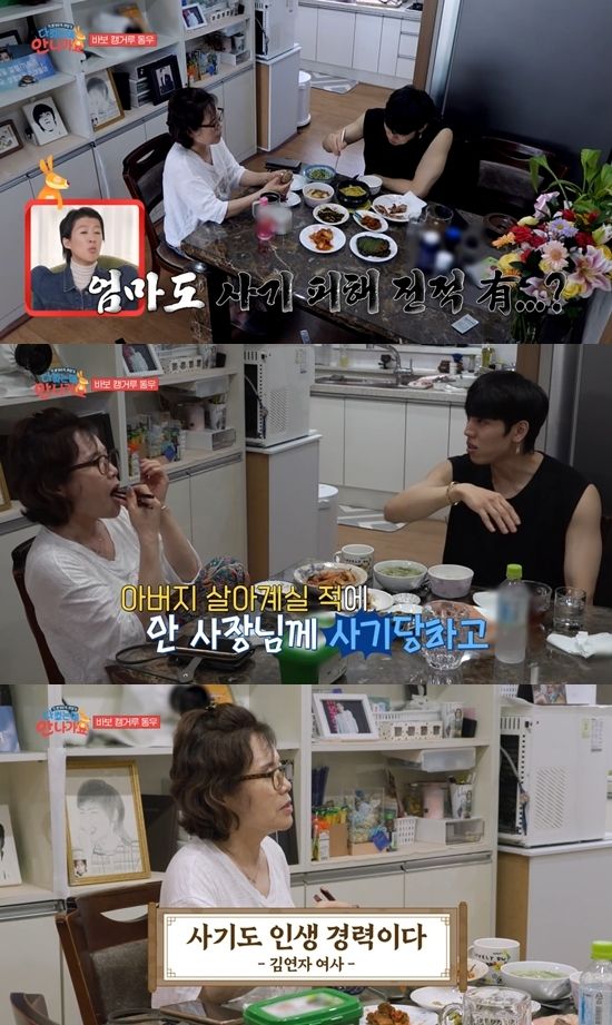 그러면서 "사기를 안 당하는 집안이 있나?"라고 묻자 장동우의 어머니는 "나도 3개월만 투자해보라고 해서 한 건데. 아무 생각 없이 10년 간 봉사 단체에서 만났으니까 100퍼센트 믿었다"라며 사기 경험을 고백했다.