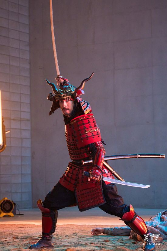 도깨비를 연상하게 했던 겐신의 트레이드 마크이자 극 중 조선 의병들을 두려움에 떨게 했던 뿔 달린 투구를 눌러쓴 채 장검과 단검을 양손에 쥐고 포즈를 취하는 모습은 극 중 캐릭터와 높은 싱크로율을 보여준다.