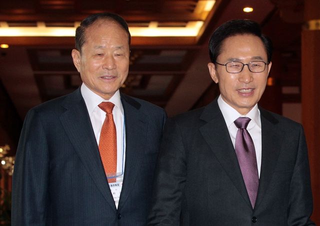 동생인 이명박 전 대통령과 지난 2011년 청와대에서 함께 이동하는 이상득 전 부의장 / 연합뉴스