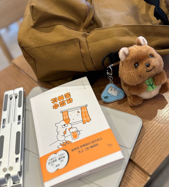 저는 초등학생 시절부터 한결같은 보부상이라서 이런 질문을 참 좋아합니다. 아이패드와 애플펜슬, 아이패드 거치대, 손목 보호대, 접이식 키보드, 헤드셋, 비상용 줄이어폰, 보조 배터리. 여기까지가 창작 아이템이고요. 그 외에도 볼펜, 업무용 수첩, 전자책 단말기, 비상용 우산, 각종 상비약, 마스크, 맥주병따개, 홍보용으로 들고 다니는 <귀여움수집가> 책과 명함… 너무 많죠? 저도 요즘 MZ처럼 쿨하게 미니백 한 개 들고 다니고 싶은데 절대 안 되네요.
