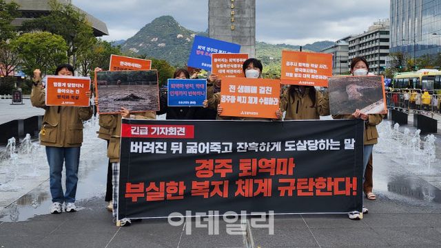 동물자유연대 등 총 12개 동물·환경단체로 구성된 ‘말 복지 수립 범국민대책위원회’는 23일 오전 광화문 이순신 동상 앞에서 기자회견을 열고 “경주마들이 퇴역 후에 복지 사각지대에 방치돼 참혹하게 죽어가고 있다”며 “말 보호를 위한 법제화가 시급하다”고 주장했다.