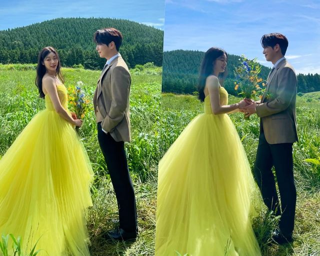 공개된 웨딩화보 속에서 신부 김연아는 말 그대로 눈부신 미모를 자랑한다. 노란색 웨딩 드레스를 입고 넓은 초원 위에 꽃을 들고 서있는 김연아는 디즈니 애니메이션 속 공주님보다 아름다운 자태로 감탄을 더한다. 고우림 역시 그런 김연아를 사랑스러운 시선으로 바라보고 있어 보는 이들의 미소를 더한다.