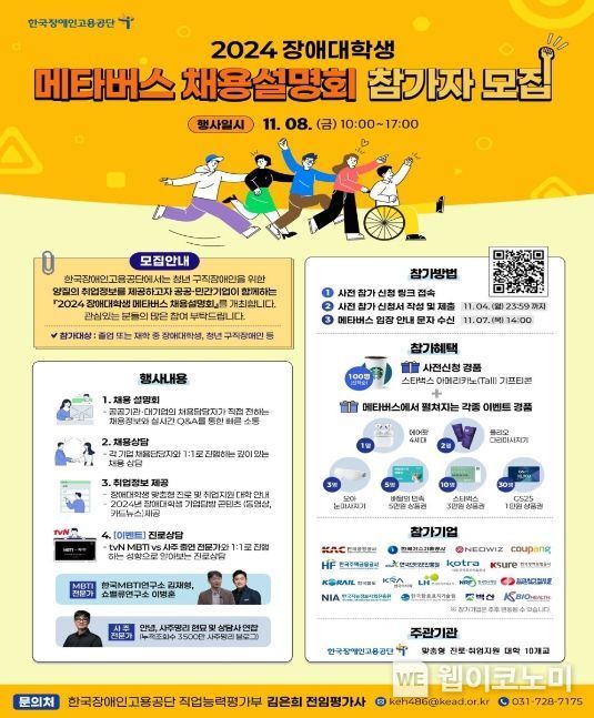 (웹이코노미) 고용노동부 한국장애인고용공단이 장애대학생 맞춤형 진로‧취업지원 대학 10개교와 함께 '2024년 장애대학생 메타버스 채용설명회' 참가자를 모집한다.