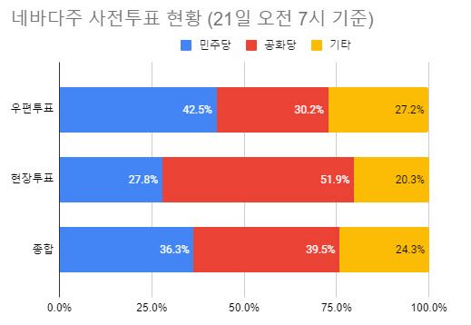 19일부터 사전투표가 시작된 네바다주에서는 공화당원들이 민주당원보다 더 많이 투표에 참여한 것으로 나타났다. 네바다주 국무부에 따르면, 네바다주에서는 21일 저녁까지 24만 5000장의 투표용지가 제출됐으며 이 중 39.5%가 공화당원의 표였다. 민주당원 표는 36.3%였다.