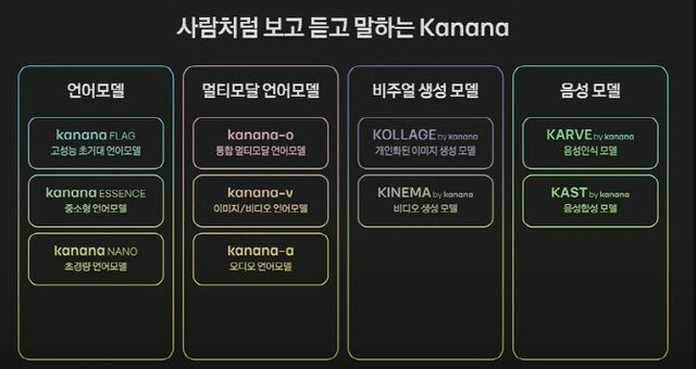 멀티모달 언어모델은 △오디오 언어모델(카나나-a) △이미지/비디오 언어모델(카나나-v) △통합 멀티모달 언어모델(카나나-o)로 구성되며 비주얼 생성 모델은 △비디오 생성 모델(키네마) △개인화된 이미지 생성모델(콜라주)로 구성된다. 음성모델은 △음성인식 모델(카브) △음성합성모델(캐스트)로 나뉜다.
