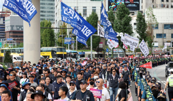 지난달 28일 오후 서울 중구 세종대로 숭례문인근에서 전국민주노동조합총연맹, 윤석열정권퇴진운동본부(준), 전국민중행동, 자주통일평화연대, 전국비상시국회의 주최로 열린 '정권 퇴진 시국대회' 집회에서 참가자들이 용산구 대통령실 방향으로 행진을 하고 있다. /사진=뉴시스