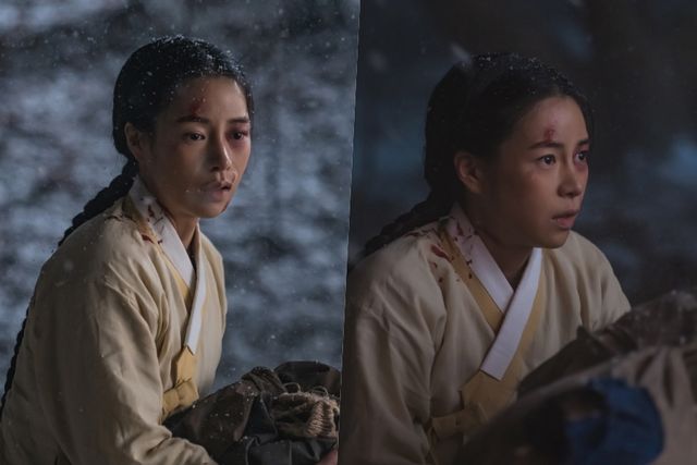 공개된 사진에는 얼굴 곳곳에 멍 자국은 물론 피투성이가 된 채 도망치는 구덕이의 모습이 포착돼 시선을 사로잡는다. 눈보라가 몰아치는 어두운 밤길, 봇짐을 꼭 끌어안은 구덕이의 초라한 행색과 두려움 가득한 눈빛에서는 신분에 앞서 한 인간으로서 생존하기 위한 처절함이 생생하게 느껴져 더욱 눈길을 끈다.