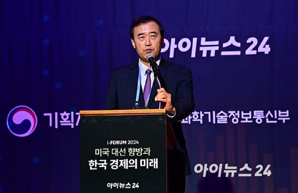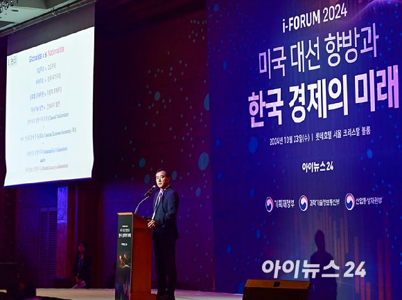 최원목 이화여자대학교 법학전문대학원 교수는 23일 서울 중구 롯데호텔 크리스탈볼룸에서 열린 '아이포럼 2024'에서 '미 대선 결과에 따른 통상 정책 변화와 대응'이라는 주제로 한국 산업이 마주한 통상 현안과 대응 전략을 발표했다.