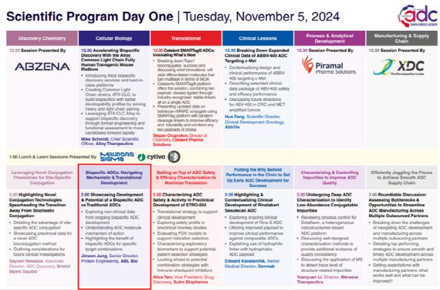 월드ADC 자료에 따르면 에이비엘바이오는 ‘기존 ADC 대비 이중항체 ADC의 잠재력과 개발 소개(Showcasing Development & Potential of a Bispecific ADC vs Traditional ADCs)’란 제목으로 발표를 진행할 계획이다.