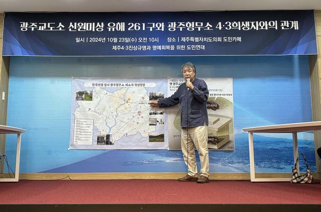 양동윤 제주4·3진상규명과 명예회복을 위한 도민연대 대표가 23일 오전 제주도의회 도민카페에서 기자회견을 열고 "옛 광주교도소 무연고자 합장묘에서 나온 신원미상 유해에 대해 4·3 희생자와의 관계를 조사해야 한다"고 주장하고 있다. / 뉴스1