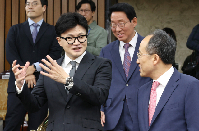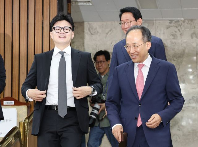 한 대표는 한편 지난 21일 자신과 윤석열 대통령과의 회동 직후 윤 대통령 주재 만찬 행사에 참석했던 추경호 원내대표와 이날 협의회 자리에 함께 웃으며 입장해 눈길을 끌었다.