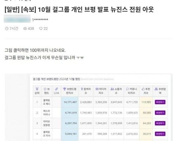걸그룹 뉴진스 멤버들이 브랜드 평판 1위에서 100위권 밖으로 밀려났다. 뉴진스 민지는 지난해 연말까지만 해도 브랜드평판 1위를 차지했었기 때문에 큰 파장이 일고 있다.