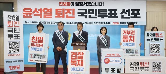 진보당 도당은 "제주도 또한 윤 정권으로 인한 피해가 극심하다. 4·3 역사왜곡 장관 임명을 강행하고 도민의 자기결정권을 외면한 채 제2공항 기본계획 고시를 강행했다"며 "중앙당과 16개 시도당에 '진보당 윤석열 퇴진 대행진단'을 결성하고 이날부터 퇴진 국민투표 운동을 시작한다"고 말했다.