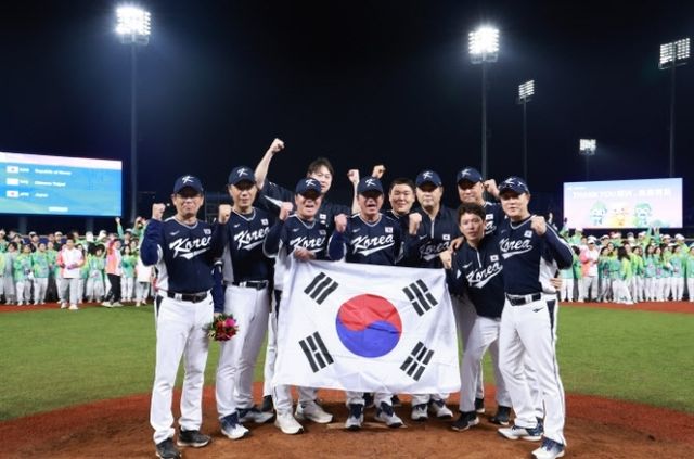 2022 항저우 아시안게임(AG) 결승에서 대만을 꺾고 금메달을 차지한 류중일 감독과 대한민국 야구 대표팀 코칭스태프들이 시상식 뒤 그라운드에서 기념사진을 찍고 있다. / 연합뉴스