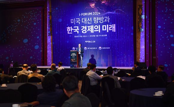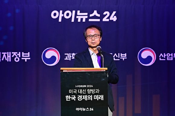 김용석 가천대 석좌교수(반도체교육원장)가 23일 서울 중구 롯데호텔 크리스탈볼룸에서 '미국 대선 향방과 한국 경제의 미래'를 주제로 열린 '아이포럼 2024'에서 이같이 말했다.