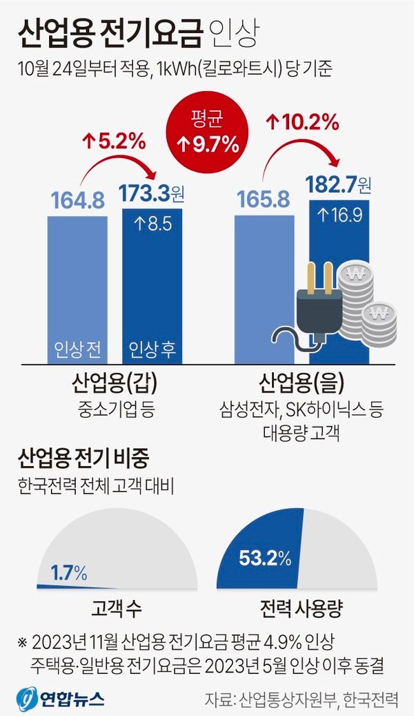 한전은 누적된 전기료 인상요인 일부를 반영하고 효율적 에너지 소비를 유도하고자 24일부터 산업용 전기요금을 평균 9.7%, 킬로와트시(㎾h)당 16.1원 인상한다고 밝혔다. 산업용 전기요금은 지난 2022년 9월 말 전체 전기료 인상 때 추가로 올랐고 지난해 11월에도 산업용 전기료만 상승했다. 올해 역시 산업용 전기만 차등 인상됐다. 산업용 전기요금만 인상된 배경은 반도체, 인공지능(AI) 등 미래 첨단산업 기반 조성을 위한 전력망 확충과 필수 전력설비 유지·보수 차원에서다. 특히 산업용 전기 수요는 전체 수요의 1.7%에 불과하지만 전체 전력 사용량을 보면 53.2%로 과반이나 된다는 논리도 작용했다. 상승률을 구체적으로 보면 전체 고객의 0.1%인 대용량 고객인 산업용(을)은 10.2% 인상되고 중소기업이 주로 사용하는 계약전력 300㎾h 미만인 산업용(갑)은 5.2% 인상된다.