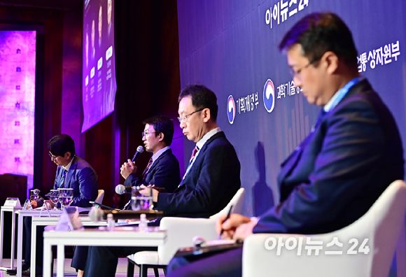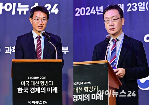 아이뉴스24는 23일 서울 중구 롯데호텔 크리스탈볼룸에서 개최한 '아이포럼 2024'에서 민정훈 국립외교원 미주연구부 교수와 강구상 대회경제정책연구원 연구위원, 김계수 성균관대학교 정보통신학과대학 교수, 조성대 한국무역협회 통상연구실 실장은 '미국 대선 향방과 한국경제의 미래'란 주제로 토론을 벌였다.