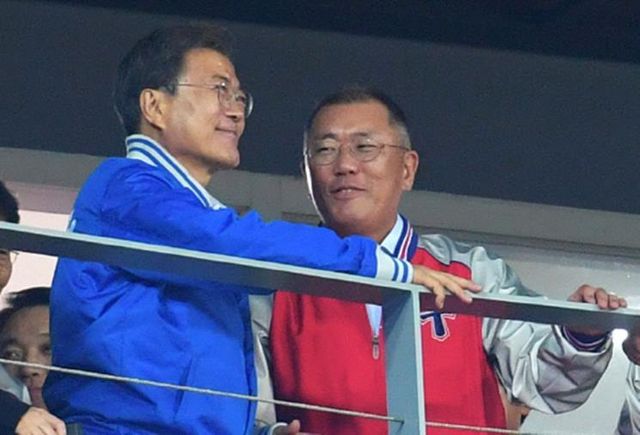 2017년 10월 25일 문재인(왼쪽) 당시 대통령과 정의선 당시 현대자동차 부회장이 광주 KIA 챔피언스필드에서 열린 2017 프로야구 한국시리즈 KIA 타이거즈와 두산 베어스 1차전 경기를 관람하며 웃고 있다./ 연합뉴스