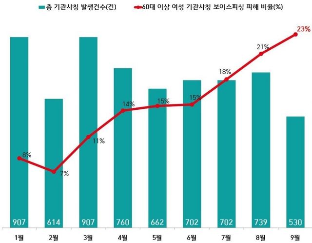 그 대신 상대적으로 더 많은 재산을 보유하고 있는 60대 이상 고령층의 피해가 증가하면서 기관사칭형 수법의 건당 피해액은 4426만 원에 달했다.