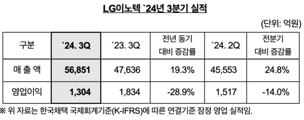 [포인트경제] LG이노텍이 올 3분기 매출 5조6851억원, 영업이익 1304억원을 기록했다고 23일 밝혔다. 전년 동기 대비 매출은 19.3% 증가, 영업이익은 28.9% 감소한 수치다.
