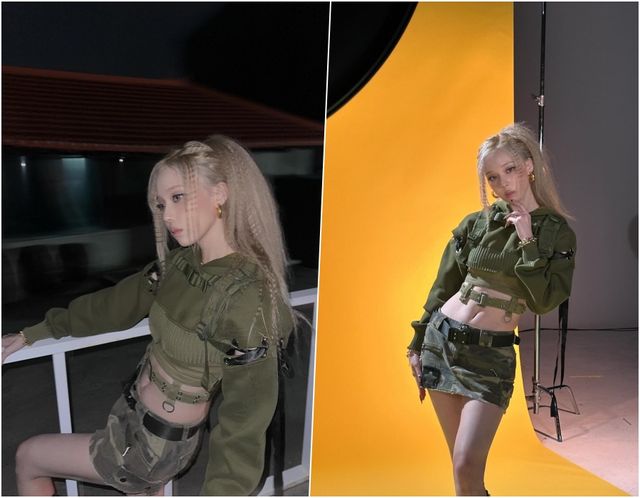 사진 속 윈터는 밀리터리 스타일의 크롭톱과 미니 스커트를 착용한 모습으로 색다른 분위기를 연출했다. 여기에 곱슬 펌을 한 스타일을 포니테일 스타일로 연출한 뒤, 볼드한 액세서리를 착용해 그간 윈터에게 볼 수 없었던 새로운 매력을 엿볼 수 있다.