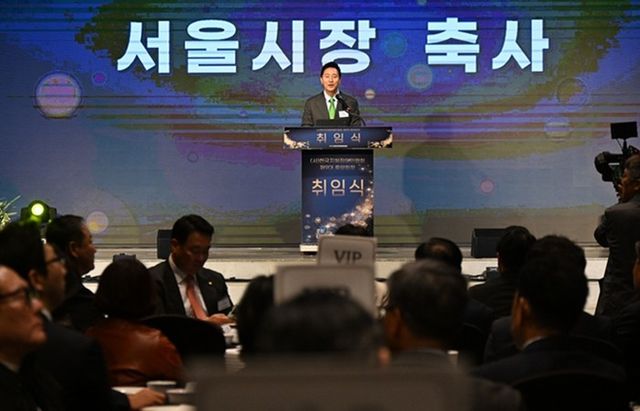 | ▲ 오세훈 시장이 23일 오전 종로구 HW컨벤션에서 열린 「제9대 한국지체장애인협회장 취임식」 에서 축사를 하고 있다. |