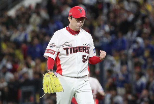23일 오후 광주 북구 기아챔피언스필드에서 열린 프로야구 '2024 신한 SOL 뱅크 KBO 포스트시즌' 한국시리즈 2차전 삼성 라이온즈와 KIA 타이거즈의 경기 5회초 2사 주자 없는 상황 KIA 양현종이 삼성 김영웅을 삼진으로 처리하고 주먹을 불끈 쥐고 있다. / 뉴스1