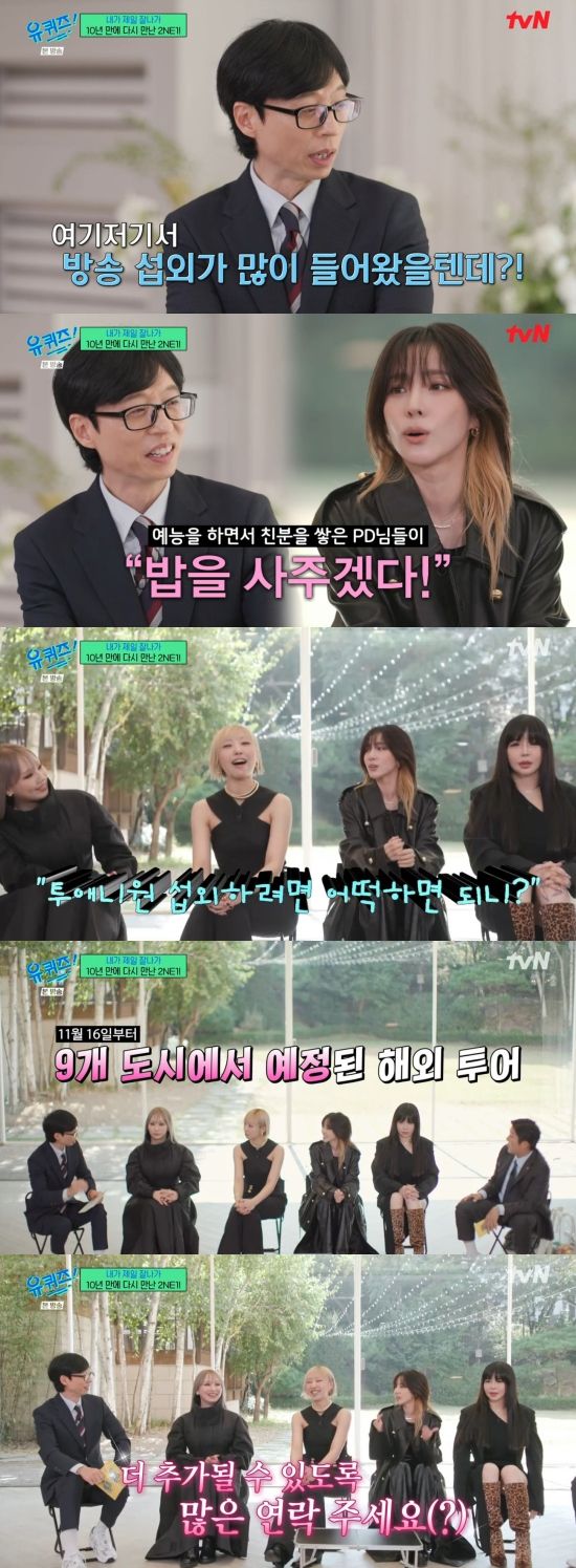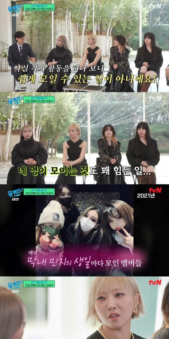 특히 유재석은 "마음만큼 쉽게 모일 수 있는 일이 아니다. 각자 소속사도 다르고. 어떻게 모이게 됐는지"라며 질문했고, 씨엘은 "저희가 사실 4개월 전만 해도 세상에서는 시스템에서는 해체된 그룹이지 않았냐. 친구들끼리 밥을 먹어도 네 명 모이기 힘든데. 그래도 꾸준히 1년에 한 번은 밥을 먹자고 해서 민지 생일 때 연초에 항상 밥을 꾸준히 먹었다. 그래서 저도 그때 코첼라도 쉽게 했던 거고"라며 설명했다.