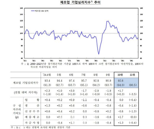 한국은행이 24일 발표한 ‘10월 기업경기조사 결과’에 따르면 전산업 기업심리지수(CBSI)는 92.1로 전월대비 0.9포인트 상승했다. 지난 6월 이후 넉달 만에 처음으로 전월비 상승 전환했지만, 다음달 전망은 전월보다 2.8포인트 하락한 89.8로 조사됐다.