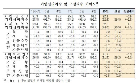 24일 한국은행에 따르면 10월 전산업 기업심리지수(CBSI)는 92.1로, 전월보다 0.9포인트(p) 상승했다. 다음 달 CBSI 전망은 전월보다 2.8p 하락한 89.8로 나타났다. 지난 2023년 11월 3.3p 하락한 이후 최대 하락 폭을 기록했다.