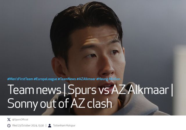 토트넘 구단은 24일(한국시간) 공식 홈페이지를 통해 손흥민의 유럽축구연맹(UEFA) 유로파리그 AZ 알크마르(네덜란드)전 결장을 공식화했다. 엔지 포스테코글루 토트넘 감독의 알크마르전 사전 공식 기자회견의 발언이 손흥민의 알크마르전 결장 공식발표의 배경이 됐다. 토트넘과 알크마르의 유로파리그 리그 페이즈 3차전은 오는 25일 오전 4시 영국 런던 토트넘 홋스퍼 스타디움에서 열릴 예정이다.